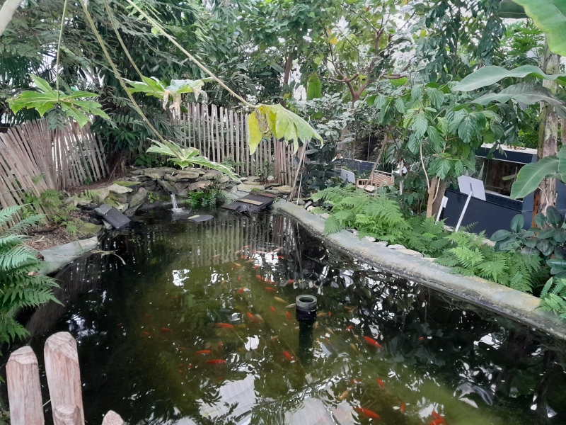 vorbei an Schildkröten und Koi Karpfen